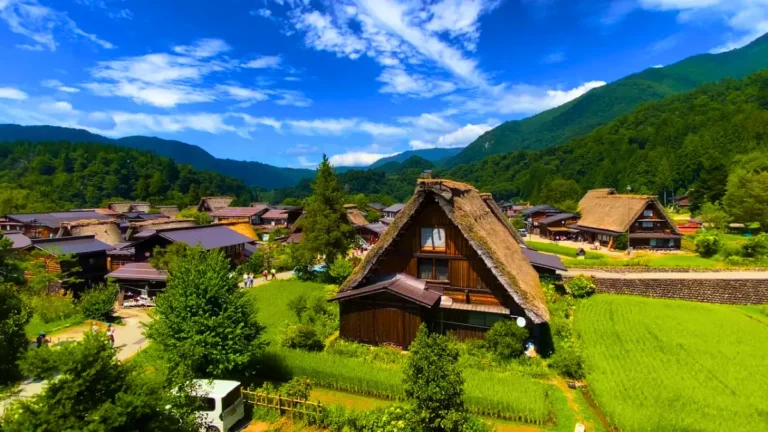 Shirakawa-go is a historic village in Japan, known for its traditional thatched-roof houses called Gassho-zukuri. These homes are designed to withstand heavy snowfall, making winter a magical time to visit. The village is surrounded by lush green fields in summer and covered in snow during winter. Visitors can explore local craft shops, try traditional Japanese food, and visit the observation deck for breathtaking views of the entire village.