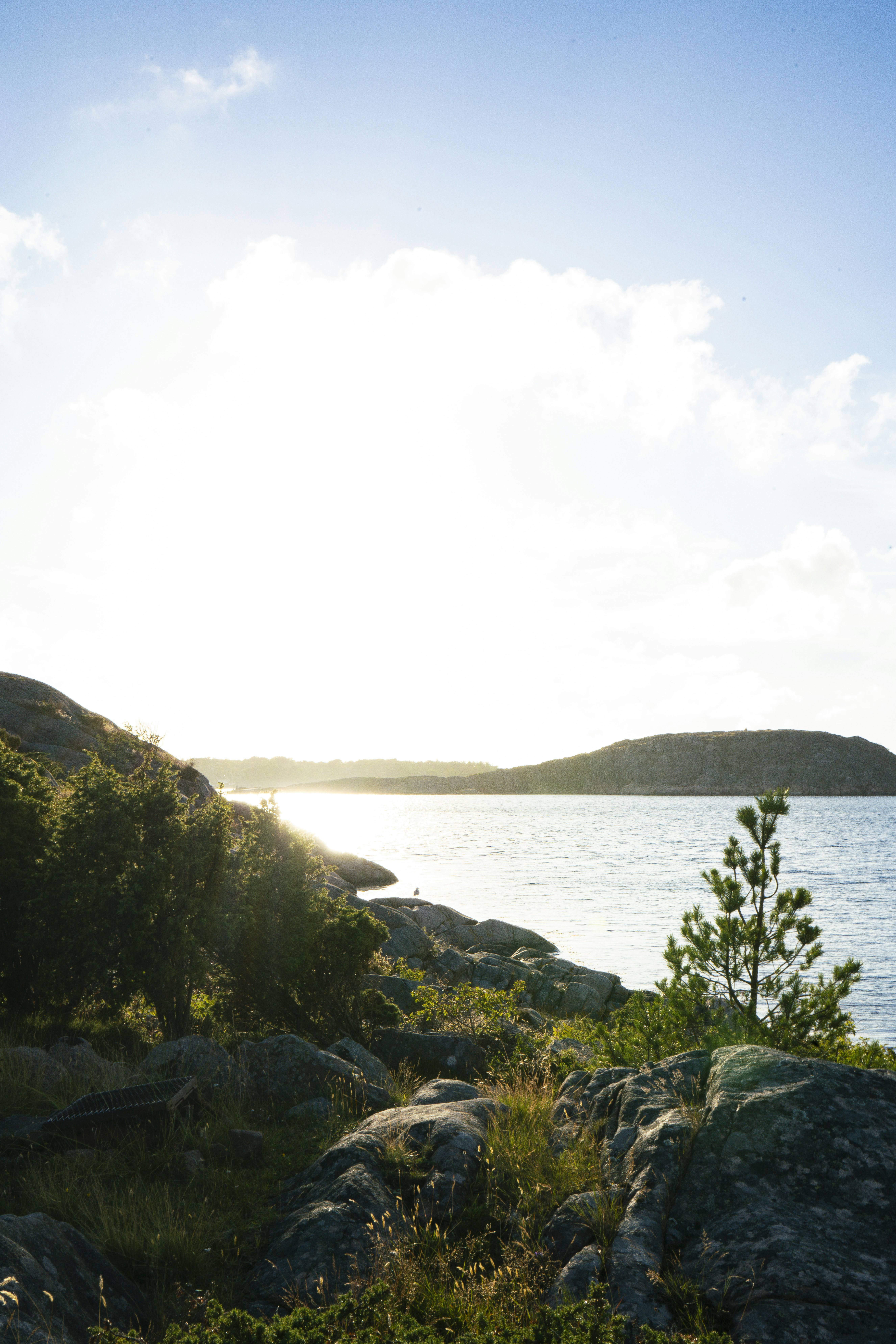 The sun is shining over the water and rocks